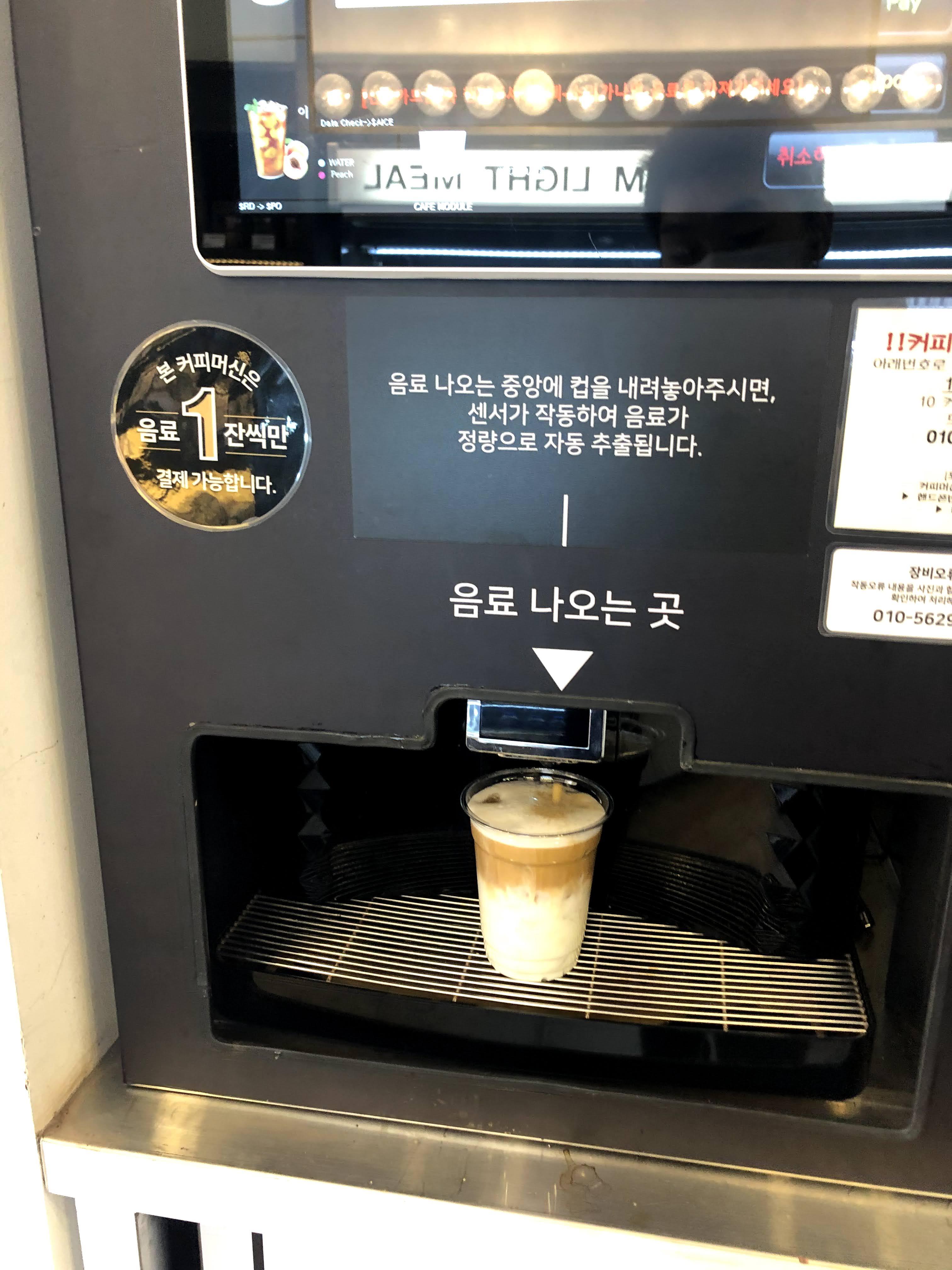 5. 그리고 적절한 타이밍에 음료 나오는 곳에 컵을 두어야 합니다.