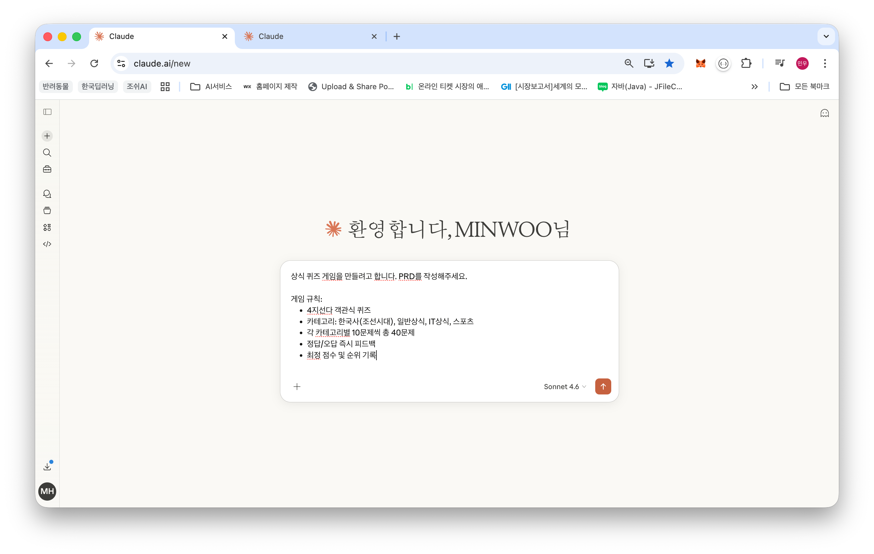 AI와 함께하는 기획, PRD도 뚝딱! 생각보다 참 쉽죠잉!?지난 번에는 할 일 목록을 만들고 자동으로 카테고리를 분류하는 것까지 해보았습니다. 이번에는 혼자서 공부하는 바이브코딩 책을 보면서 "상식 퀴즈 게임을 만들려고 합니다. PRD 작성부터 Claude AI의 도움을 받아서 진행했습니다.Claude.ai에 접속해서 "상식 퀴즈 게임을 만들려고 합니다. PRD를 작성해주세요." 라고 딱 한 문장 던지면 Claude가 순식간에 핵심 요구사항을 정리해줍니다. 100% 완벽하지 않더라도 초안으로 사용하기에 아주 적절합니다. 그리고 디테일한 부분은 역시 사람이 개입해서 완성도를 높여주면 더 좋습니다.Claude가 제안한 핵심 게임 규칙:다양한 카테고리: 한국사, 일반상식, IT상식, 스포츠까지 4가지나!문제..