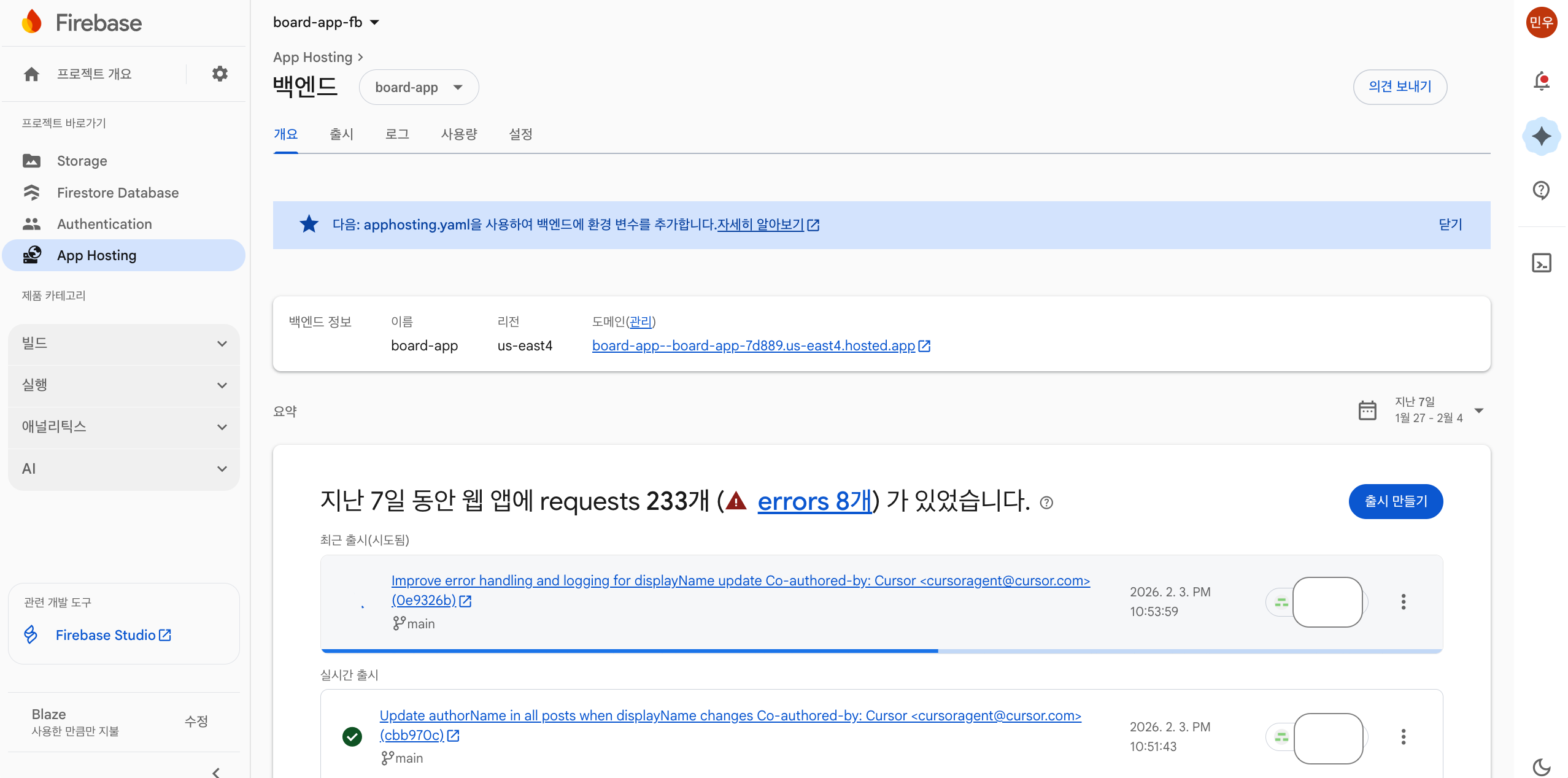 - Firebase App Hosting이 자동으로 빌드 & 배포