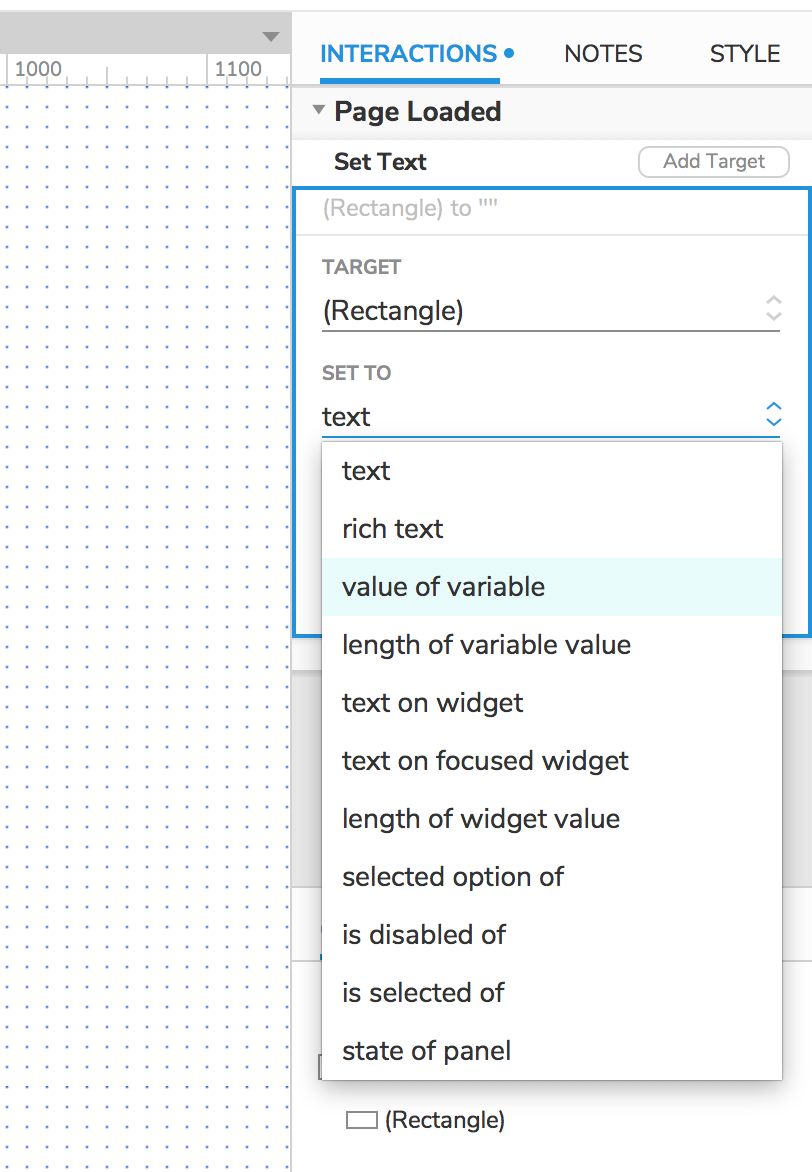 SET TO에 value of variable를 선택합니다. 페이지가 로드될 때, 출력상자(Box, Rectangle)에 Global Variables - TextInputVar의 값을 불러와서 출력한다는 의미입니다.