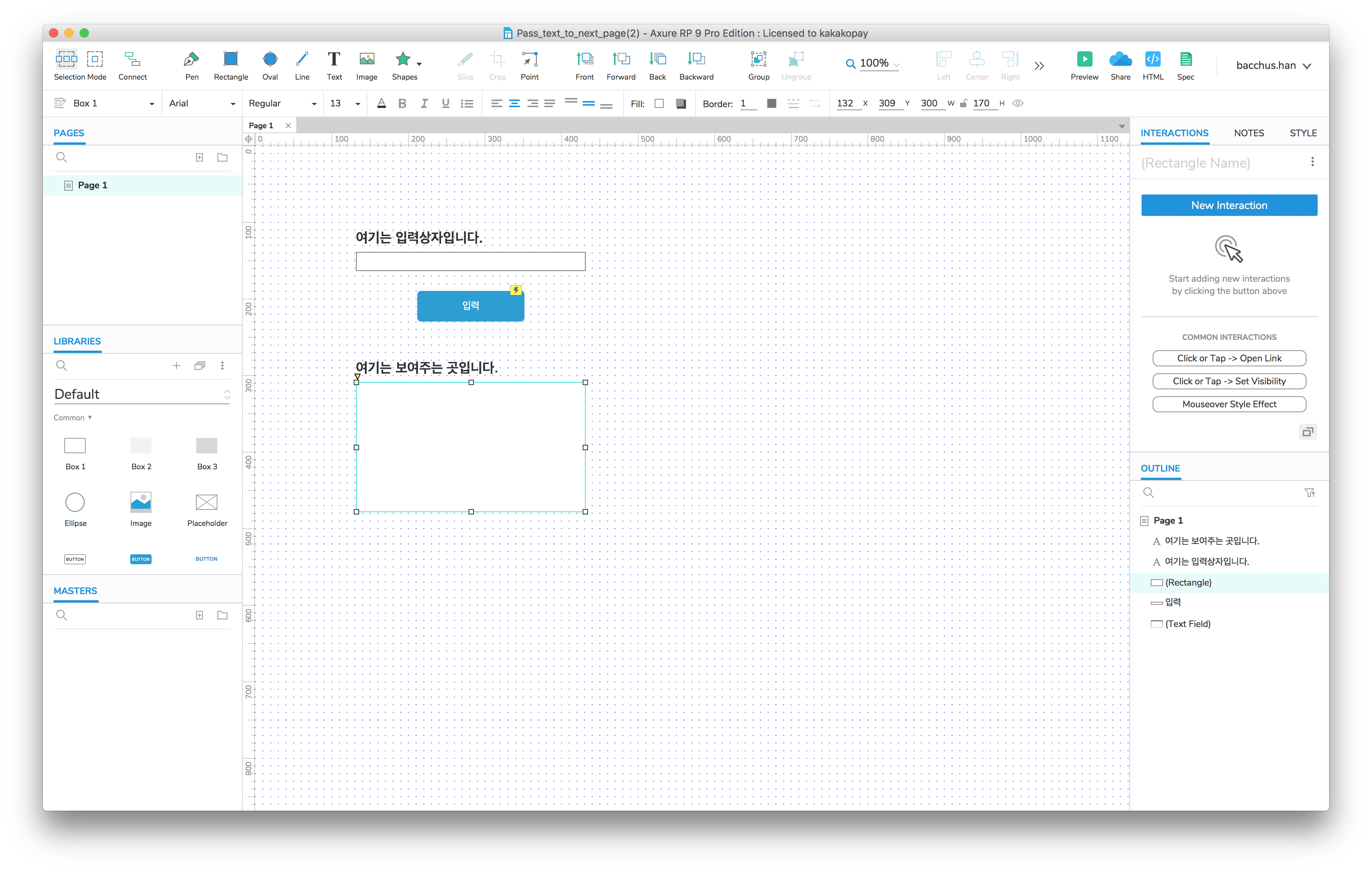 이번 포스팅에서는 입력상자에 텍스트를 입력받고 버튼을 클릭하여 다른 페이지(혹은 현재 페이지의 다른 도형/객체)에 텍스트를 출력하도록 하는 기능인 Pass Text to Next Page를 소개하겠습니다. 이제부터 본격적인 Interactions 기능을 체험할 수 있는데요. 액슈어(Axure)로 프로토타이핑(Prototyping)을 제작했을 때의 매력은 마치 실제로 작동하는 것처럼 보이게 하는 feasiablity가 높은 프로토타이핑(Prototyping)을 제작할 수 있기 때문이 아닐까 생각합니다.