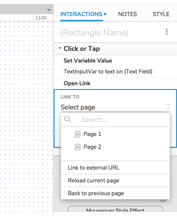 Clicke or Tap - '+'를 클릭하여 INTERACTIONS - Open Link를 추가합니다. Select page에는 Page2를 선택합니다.