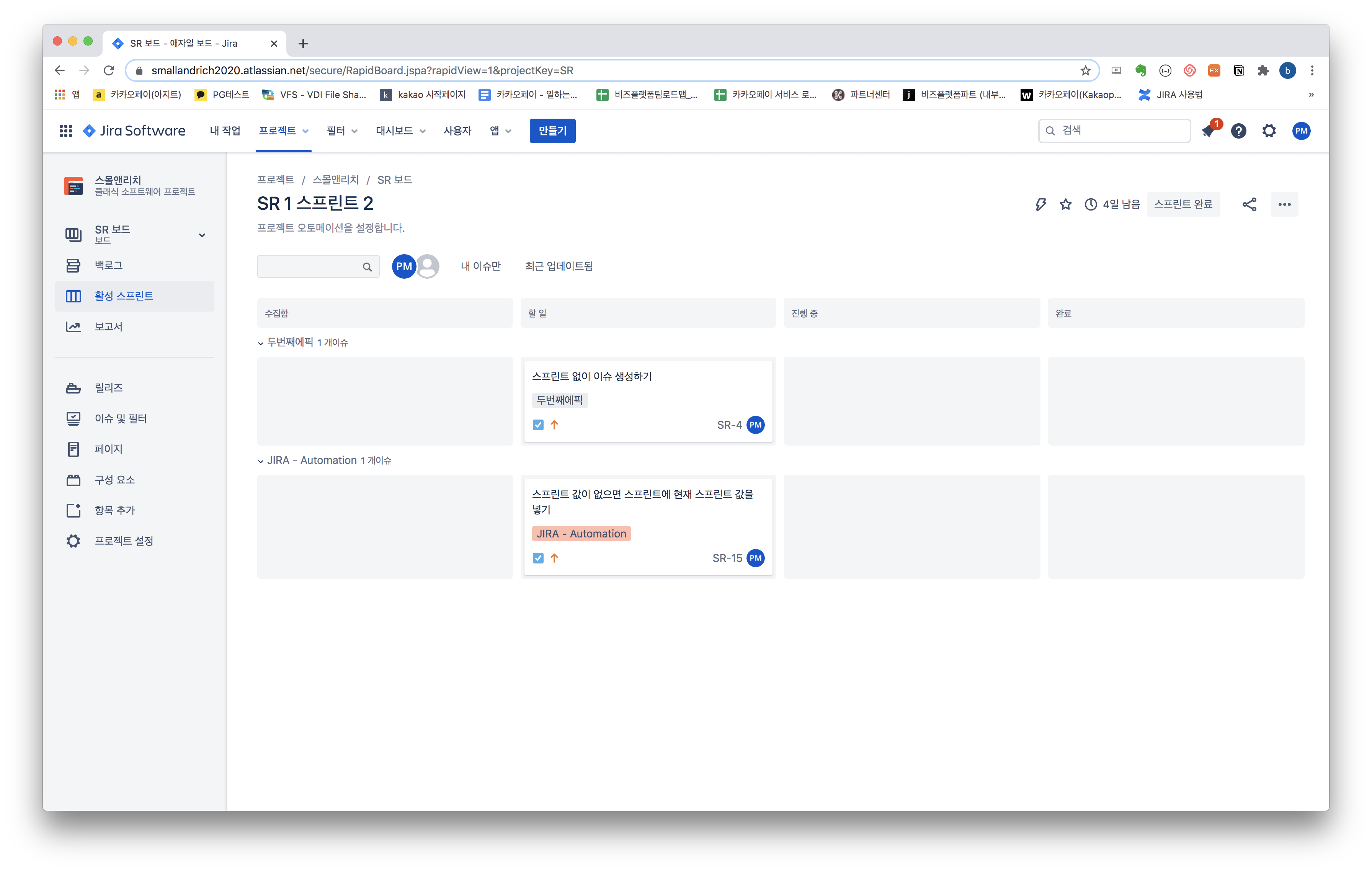 활성 스프린트 보드로 돌아와서 새로운 이슈를 등록하여 Automation rule이 잘 작동하는지 확인해보겠습니다.