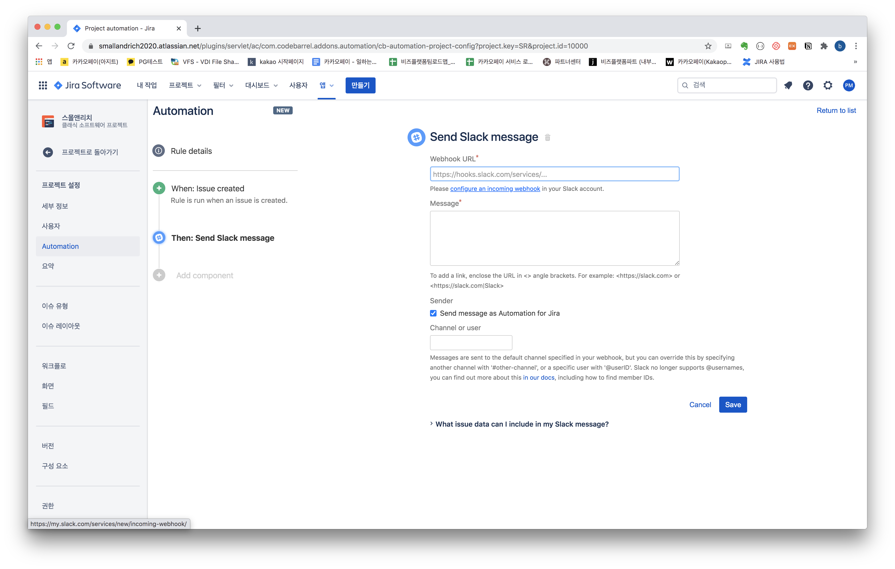 자! 이제 완성된 지라에서 슬랙메시지 자동화 설정을 확인해봅니다.