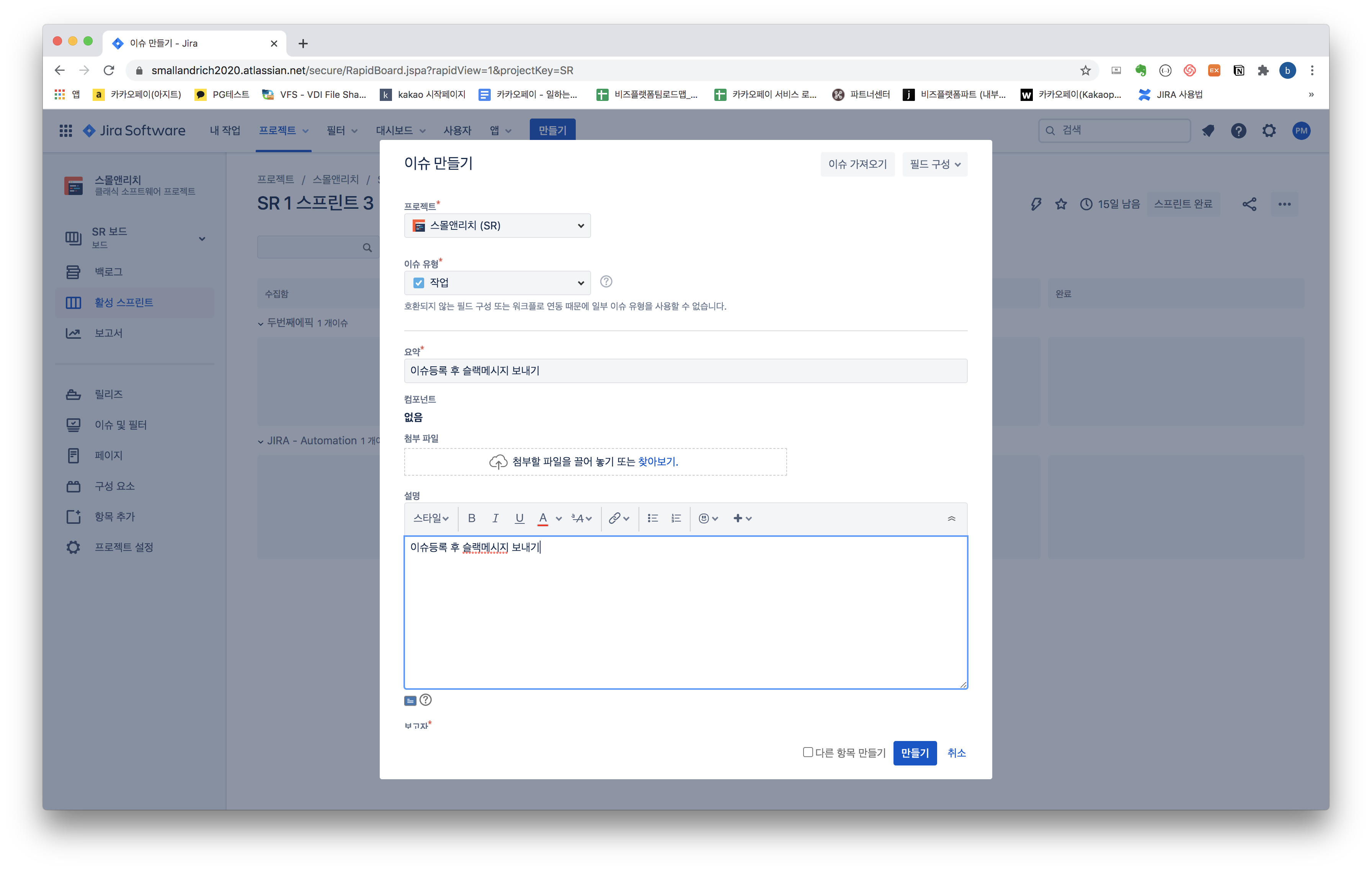 "이슈를 생성할 때" / "슬랙으로 메시지 보내기"