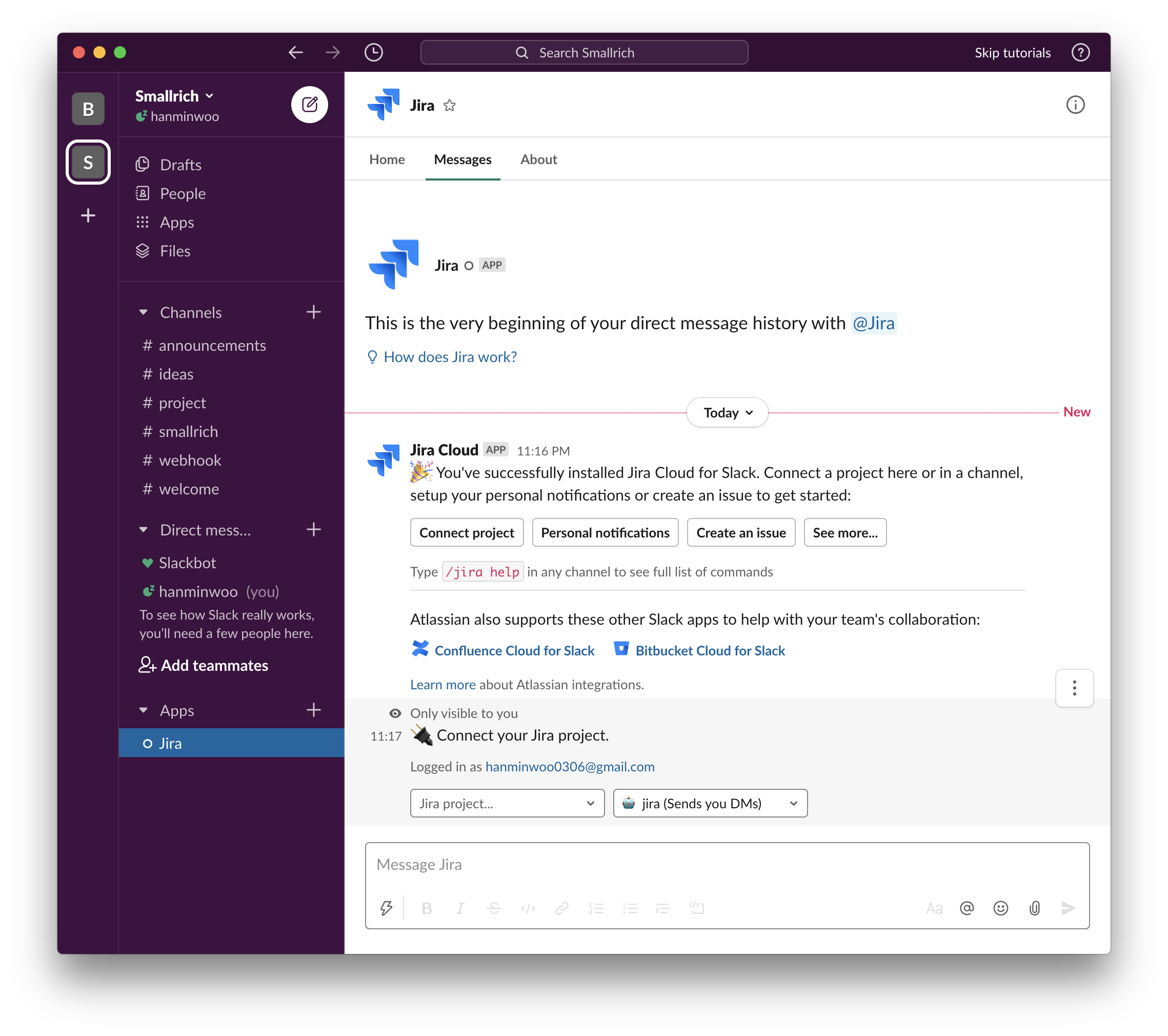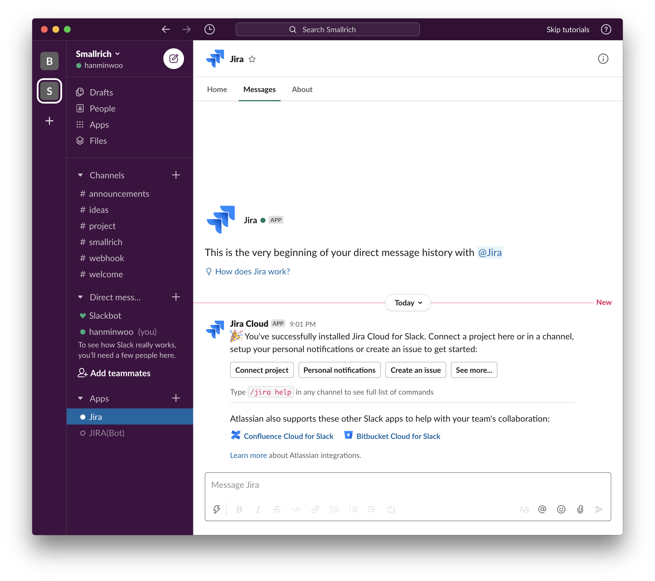 슬랙 메신저를 확인합니다. 그리고 "Connect project"를 클릭하여 JIRA Project를 연결합니다.