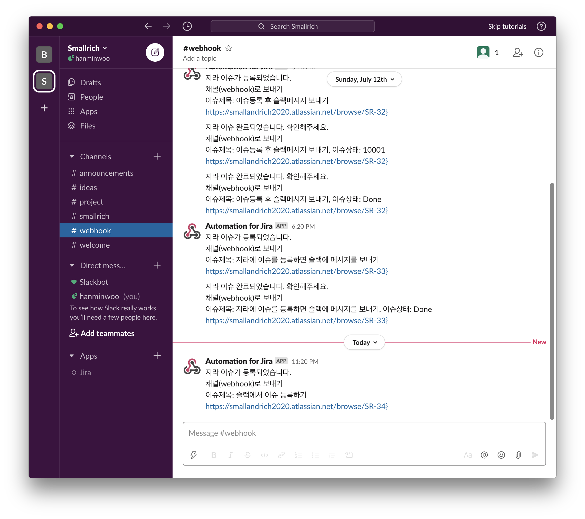슬랙(Slack) 채널과 지라(JIRA) 프로젝트가 연결되었습니다. 짝짝짝